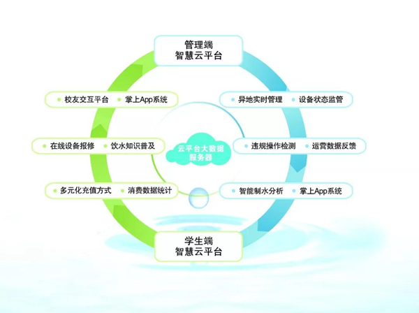 此外,榮事達著眼校園直飲水的互聯(lián)網化建設,依托先進的云端大數據平臺、無線網絡體系和智能一卡通技術等,創(chuàng)新打造ultraWiFi智慧管理系統(tǒng),系統(tǒng)直連ultraWiFi凈水主機、開水器、飲水機等終端定制設備,實現精細化管理。學生在使用中不僅能查詢飲水消費記錄、在線報修設備、與校友交流等,還能擁有多元化充值方式選擇,充分享受快捷的智能化飲水體驗。 同時設備運營商也可通過電腦或手機APP端口接入云數據平臺,異地監(jiān)測工程運行狀況,實時掌握水電成本、消費收益、設備狀態(tài)等數據信息,日常管理更簡單。