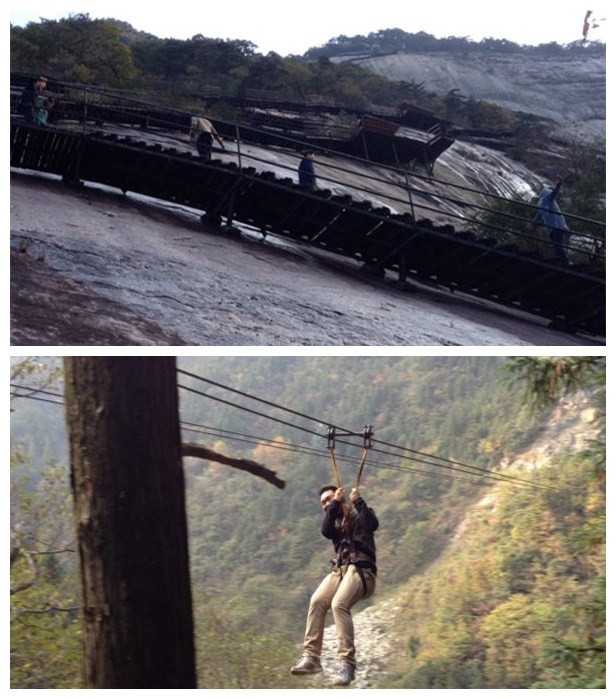 次日,在事業(yè)部總經(jīng)理王悅生的帶領(lǐng)下,市場部、招商部人員挑戰(zhàn)自我、峽谷飛渡,體驗了全長600米的溜索;勇攀矗立在懸崖峭壁上的白馬峰棧道,登峰頂、鳴古鐘,奏響勝利的號角。