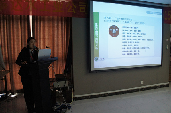 會上,公司企劃總監(jiān)劉海燕將廣告法條例與公司企宣工作案例相結(jié)合,用精心準(zhǔn)備的PPT具體詳細(xì)地講解了新法實施后企業(yè)宣傳中需要整改和注意的要點。從極限詞的禁用到產(chǎn)品代言新規(guī)定;從產(chǎn)品外包裝規(guī)范到市場活動宣傳注意事項;從企業(yè)印刷物料整改到線上線下統(tǒng)一規(guī)范,劉總在會上明確要求各部門在實際工作中必須堅決貫徹“從嚴(yán)”的原則,認(rèn)識上從嚴(yán),執(zhí)行上從嚴(yán),監(jiān)督上從嚴(yán)。