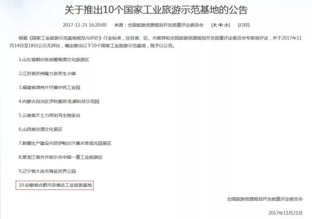 - 11月21日,全國(guó)旅游資源規(guī)劃開發(fā)質(zhì)量評(píng)定委員會(huì)發(fā)布公告,公布10個(gè)國(guó)家工業(yè)旅游示范基地,安徽省合肥市榮事達(dá)工業(yè)旅游基地成為安徽省唯一入選單位。