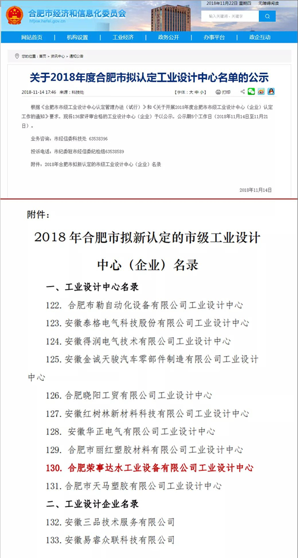 近日,合肥市經(jīng)濟和信息化委員會公布了2018年度合肥市市級工業(yè)設計中心(企業(yè))名單,合肥榮事達水工業(yè)設備有限責任公司工業(yè)設計中心赫然在列,獲評“合肥市市級工業(yè)設計中心”。