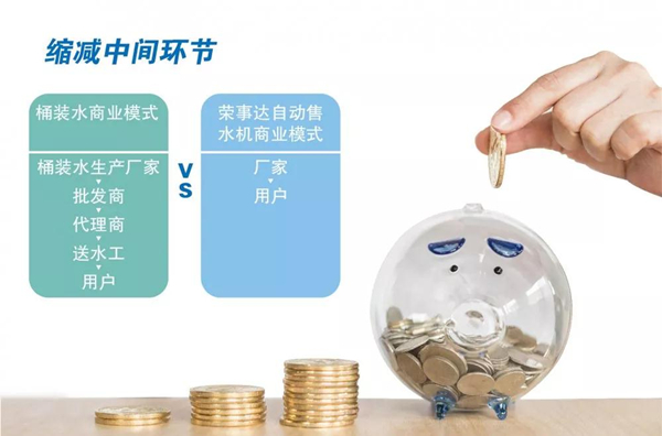 桶裝水的價(jià)格包含廠家生產(chǎn)成本、批發(fā)商差價(jià)、代理商差價(jià)、運(yùn)輸成本、送水工人力成本等諸多費(fèi)用,中間環(huán)節(jié)太多,最終還是有消費(fèi)者買(mǎi)單,而自動(dòng)售水機(jī)則是廠家直面用戶,大大縮減中間環(huán)節(jié),讓利于客戶,一桶水的價(jià)格相比市面上的品牌桶裝水價(jià)格要少50%以上,大大節(jié)省企業(yè)開(kāi)支。
