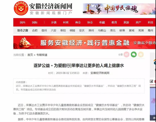 安徽經(jīng)濟(jì)新聞網(wǎng) 《逐夢公益 · 為愛前行|榮事達(dá)讓更多的人喝上健康水》
