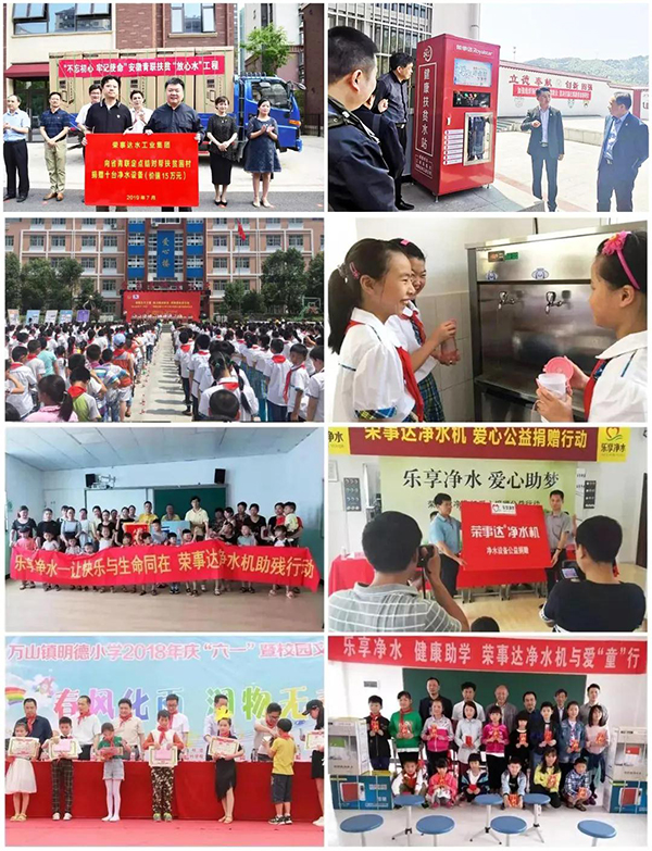 榮事達(dá)水工業(yè)從事凈水行業(yè)十余年,始終堅(jiān)守企業(yè)發(fā)展與公益事業(yè)同趨共行。榮事達(dá)自2010年發(fā)起“樂(lè)享凈水”公益行動(dòng),在全國(guó)范圍內(nèi)開展“健康助學(xué)”、“愛(ài)心助殘”、“愛(ài)心敬老”等各類公益幫扶,捐贈(zèng)、安裝凈水設(shè)備數(shù)千套;向全國(guó)首個(gè)希望小學(xué)——金寨希望小學(xué)捐贈(zèng)直飲水設(shè)備,并聯(lián)合金寨希望公益服務(wù)中心及地方公益協(xié)會(huì)共同發(fā)起“給山區(qū)孩子一杯水”——援建金寨中小學(xué)凈水設(shè)備公益活動(dòng),向金寨縣全縣中小學(xué)援建直飲水設(shè)備400多套,該項(xiàng)目也被評(píng)為“安徽省十佳學(xué)雷鋒志愿服務(wù)項(xiàng)目?jī)?yōu)秀典型”;攜手中華少年兒童慈善救助基金會(huì)發(fā)起成立“健康飲水專項(xiàng)基金”,開展各類校園飲水健康保障工作;攜手安徽?qǐng)F(tuán)省委、省青聯(lián)啟動(dòng)“青力扶貧聯(lián)創(chuàng)夢(mèng)想”健康扶貧“放心水”工程,向安徽地區(qū)多個(gè)貧困村捐贈(zèng)凈水設(shè)備,建立健康扶貧水站等。