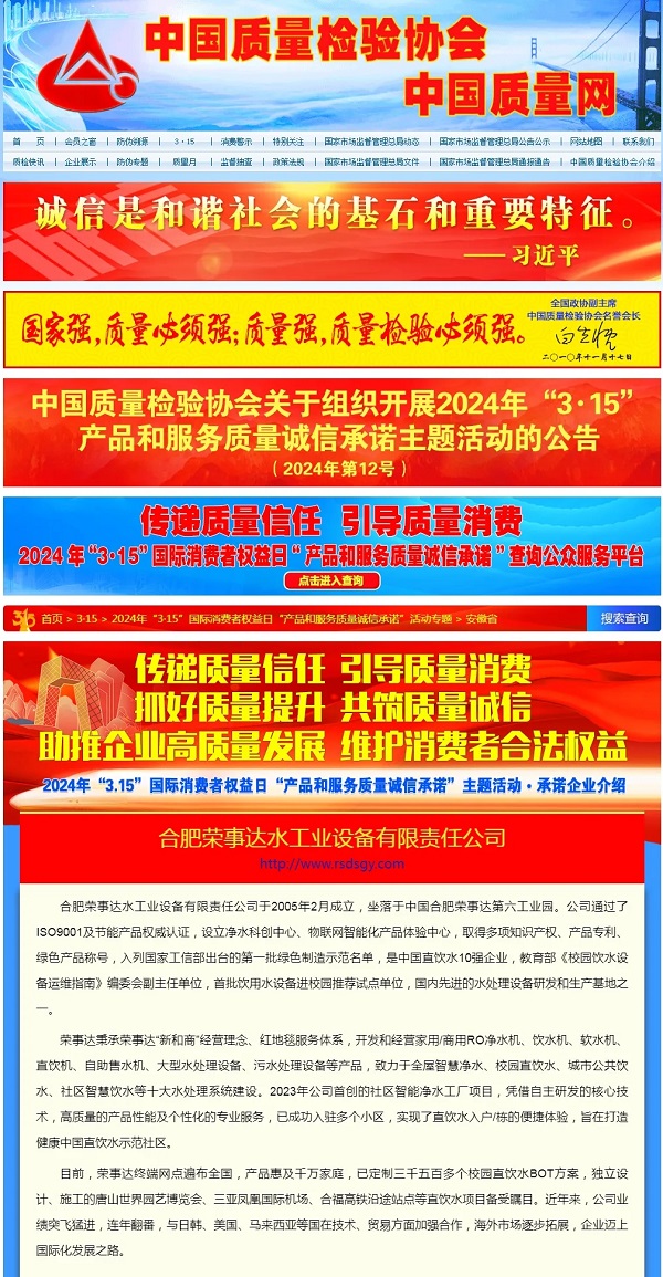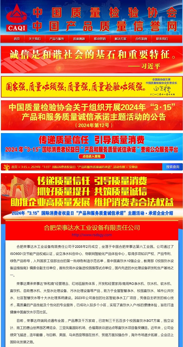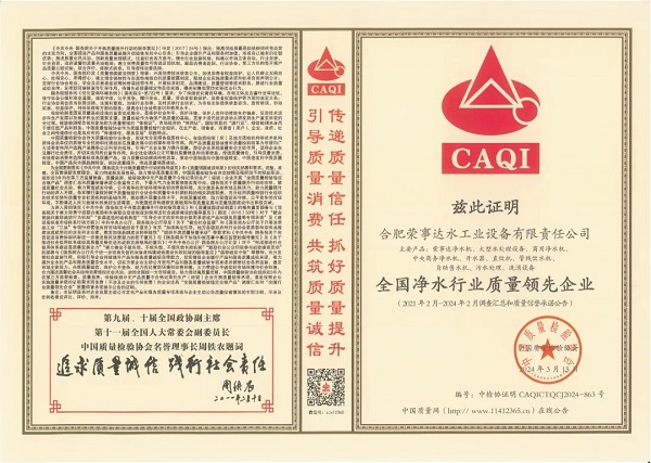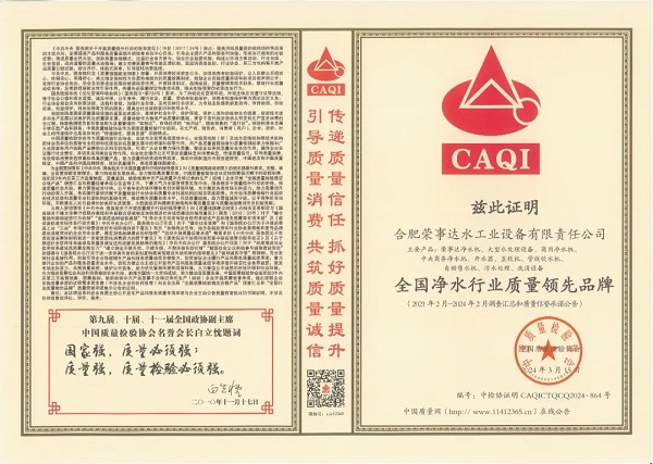 傳遞質(zhì)量信任,引導(dǎo)質(zhì)量消費。 在由中國質(zhì)量檢驗協(xié)會主辦的2024年“3·15”產(chǎn)品和服務(wù)質(zhì)量誠信承諾的主題活動中,榮事達(dá)水工業(yè)公司憑借卓越的產(chǎn)品品質(zhì)及良好的社會形象,獲得協(xié)會以及權(quán)威專家的一致認(rèn)可,榮膺 “全國產(chǎn)品和服務(wù)質(zhì)量誠信示范企業(yè) ”“全國凈水行業(yè)質(zhì)量領(lǐng)先企業(yè)”“全國凈水行業(yè)質(zhì)量領(lǐng)先品牌”“全國產(chǎn)品和服務(wù)質(zhì)量誠信品牌”“全國質(zhì)量檢驗穩(wěn)定合格產(chǎn)品”“全國質(zhì)量檢驗信譽(yù)保障產(chǎn)品”“全國消費者質(zhì)量信譽(yù)保障產(chǎn)品 ”多項榮譽(yù)。