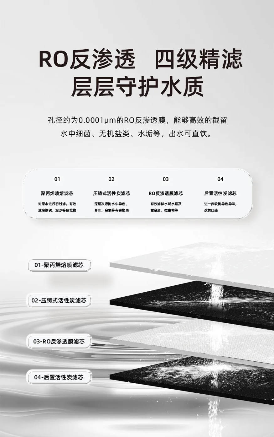 好凈水機的核心是“濾得干凈,用得省心”。新品四級精濾系統(tǒng)為自來水設四道關卡:第一道聚丙烯熔噴濾芯篩除鐵銹、泥沙,讓水變清;第二道壓鑄式活性炭吸附怪味和余氯,告別燒水異味;第三道RO反滲透膜(0.0001μm孔徑)攔截重金屬、微生物、水垢,過濾后可直飲且清甜;最后后置活性炭調(diào)口感,讓泡茶更香、煲湯更入味。