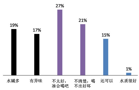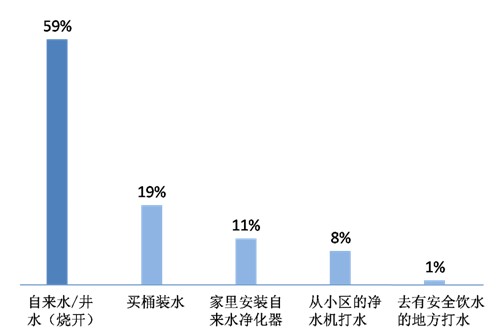 圖1. 對(duì)所住地區(qū)自來水的直觀感受另外有兩成(21%)被訪者表示“不清楚,喝不出好壞”——百姓飲用水成本越來越高,為了水杯里的安全,多數(shù)人選擇水消費(fèi):購(gòu)買桶裝水、安裝自來水凈化器、從小區(qū)凈水機(jī)打水成為主流選擇,購(gòu)買安全飲水正為成百姓居家繼“柴米油鹽醬醋茶”之后的“開門第八件事”。六成(59%)被訪者平時(shí)飲用水的最主要來源是“自來水/井水(燒開)”。也有不少人購(gòu)買桶裝水(19%)或是從小區(qū)凈水機(jī)打水(8%)來飲用。“家里安裝自來水凈化器”的被訪者也不少,為11%。