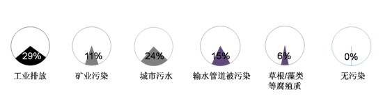 圖2. 家庭飲用水的主要來源工礦產(chǎn)業(yè)、農(nóng)藥化肥、生活污水成百姓飲水安全三大“攔路虎”本次調(diào)查分別向被訪者所感受到的城市鄉(xiāng)村的水污染情況進(jìn)行了解,其中重點(diǎn)調(diào)查了百姓認(rèn)識(shí)到的本地水污染的源頭。——污染源:城市水污染主要與產(chǎn)業(yè)結(jié)構(gòu)有關(guān),工業(yè)排放(29%)和“礦業(yè)污染”(11%)對(duì)水資源的污染占到四成。值得關(guān)注的是,“城市污水”污染被24%被訪者認(rèn)為其是主要污染源。蘭州水污染事件讓人們注意到了“輸水管道被污染”對(duì)水安全造成的影響,15%被訪者認(rèn)為自己所住城市的水污染受此影響。有專家分析水污染,認(rèn)為“草根、藻類等腐殖質(zhì)”是主要原因之一,被訪者中6%接受這一看法。