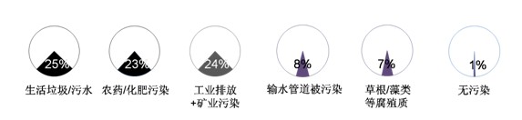 圖3. 居住在城市的受訪者對(duì)所住市縣污染源的認(rèn)知認(rèn)為所住城市水資源“無污染”的幾乎沒有——在農(nóng)村,近半數(shù)被訪者認(rèn)為危害水安全的是“生活垃圾、污水”(25%)和“農(nóng)藥、化肥”(23%),比例遠(yuǎn)超“工業(yè)排放”(16%)和“礦業(yè)污染”(8%),農(nóng)村亦存在不少“輸水管道被污染”從而污染水資源的現(xiàn)象(8%),極少數(shù)被訪者表示所居住的鄉(xiāng)村水資源“無污染”(1%)。