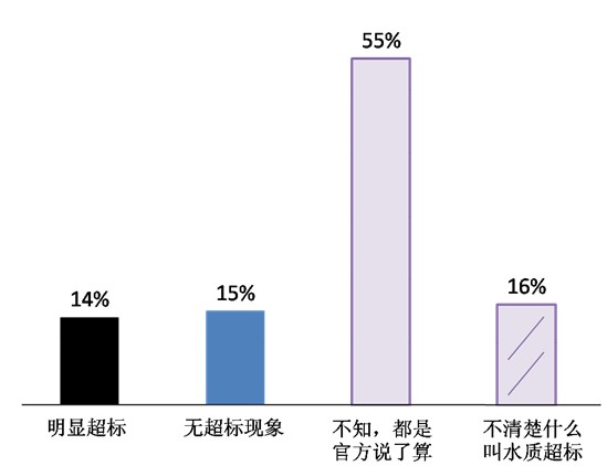 圖4. 居住在鄉(xiāng)村的受訪者對(duì)污染源的感受水安全信息“后知后覺”,百姓健康權(quán)利被透支本次調(diào)查的結(jié)果,體現(xiàn)出了水污染的嚴(yán)重程度、最主要的污染源等問題,然而比這些問題更值得關(guān)注的現(xiàn)象,是人們對(duì)攸關(guān)家人健康的環(huán)境信息的“后知后覺”、獲取水環(huán)境信息時(shí)的困難。據(jù)環(huán)保部今年3月14日發(fā)布的研究結(jié)果顯示,全國(guó)2.8億居民飲用水存在不安全問題。但是,當(dāng)我們問到“據(jù)您所知,所住地區(qū)是否有飲用水超標(biāo)現(xiàn)象”時(shí),并沒能直接得到關(guān)于百姓身邊飲用水超標(biāo)程度的認(rèn)知結(jié)果,數(shù)據(jù)呈現(xiàn)的是人們對(duì)“飲用水水超標(biāo)”問題的無奈。——對(duì)于“水杯里的飲水安全”,只有不到三成的被訪者給了我們“明顯超標(biāo)”(14%)或“沒有超標(biāo)現(xiàn)象”(15%)的明確答案。七成被訪者對(duì)此一片茫然:55%被訪者表示“不知道,超不超標(biāo)都是官方說了算”,16%的人甚至“不清楚什么叫水質(zhì)超標(biāo)”。