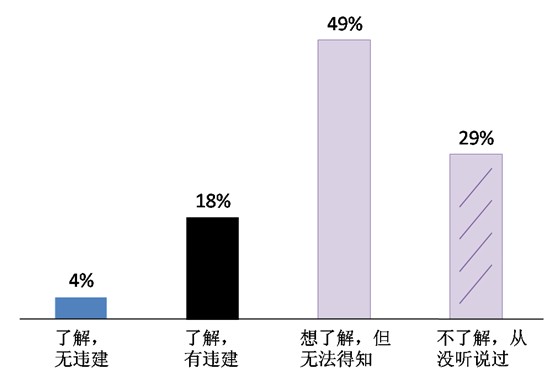 圖5. 對(duì)所住地區(qū)飲用水水質(zhì)超標(biāo)現(xiàn)象的感受我國(guó)劃分了飲用水水源的一級(jí)、二級(jí)保護(hù)區(qū)?!吨腥A人民共和國(guó)水污染防治法》規(guī)定,在一級(jí)保護(hù)區(qū)內(nèi),禁止與供水設(shè)施和保護(hù)水源無關(guān)的建設(shè)項(xiàng)目;二級(jí)保護(hù)區(qū)內(nèi),禁止排放污染物的建設(shè)項(xiàng)目。——對(duì)“飲用水水源保護(hù)區(qū)”這一攸關(guān)群眾飲水安全和健康權(quán)的規(guī)定,只有兩成群眾表示“了解”,并明確地告訴我們“有違建項(xiàng)目”(18%)或“無違建項(xiàng)目”(4%)。八成被訪者對(duì)此并不知曉,29%的人“從沒聽說過”,也并沒有想要了解的意愿。半數(shù)(49%)被訪者“想了解”,但無奈于“信息不透明,無法得知”。