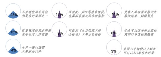 圖6. 對(duì)所住地區(qū)“飲用水水源保護(hù)區(qū)”保護(hù)情況的了解本次調(diào)查同時(shí)詢問了被訪者對(duì)一些水安全知識(shí)的認(rèn)知相對(duì)而言,人們對(duì)一些科普、知識(shí)性的信息認(rèn)知度較高,“過量、不合理使用化肥、農(nóng)藥是水污染源之一”已經(jīng)較為廣泛地被人們所了解(23%);不少人也清楚“汞、砷等有毒物超標(biāo)的水即使只是洗手也會(huì)對(duì)人體有害”(15%),即使是“生產(chǎn)一張A4紙所需要的水資源約10升”這樣的“冷知識(shí)”,也有一定被訪者有所了解(4%)。——對(duì)于自己在水安全方面,有哪些權(quán)利、如何維護(hù)等問題,人們有所了解,但人數(shù)比例較低。例如17%知道“渾濁度、異味等感官性狀,也屬于國(guó)家規(guī)定的水質(zhì)檢測(cè)指標(biāo)”,而只有9%的人知道“想了解水質(zhì)檢測(cè)有哪些指標(biāo),可查詢《生活飲用水安全標(biāo)準(zhǔn)》”;在維權(quán)方面,14%被訪者知道“受害人有權(quán)要求排污方排除危害、賠償損失”,8%知道“公眾可以依法向水質(zhì)檢測(cè)部門申請(qǐng)檢測(cè)數(shù)據(jù)”,“目前全國(guó)有30個(gè)地級(jí)以上城市可撥打12320舉報(bào)水污染事件”,但只有3%的被訪者了解這一點(diǎn),6%的被訪者對(duì)上述我們所提出的水安全知識(shí)表示“一概不知”。