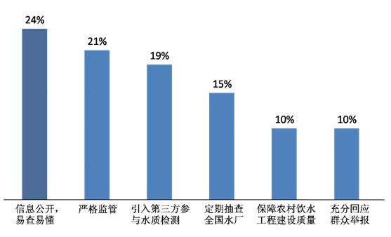 圖7. 被訪者對(duì)于水安全知識(shí)的了解情況改善“水杯民生”,當(dāng)從實(shí)現(xiàn)公民環(huán)境知情權(quán)開始當(dāng)我們問到“在水安全問題上,目前最希望政府做些什么”,不少被訪者選擇了“依法嚴(yán)格監(jiān)管”(21%)、“引入第三方參與水質(zhì)檢測(cè)”(19%)、“定期對(duì)全國(guó)的水廠進(jìn)行抽查”(15%)和“保障農(nóng)村飲水工程建設(shè)質(zhì)量”(10%)。然而比起這些“管控”措施,人們最希望的是“信息公開,并使公眾易查、易懂”(24%)。這充分體現(xiàn)了百姓對(duì)于維護(hù)自身環(huán)境健康權(quán)益的強(qiáng)烈需求:公民環(huán)境權(quán)益的實(shí)現(xiàn),離不開最起碼的環(huán)境知情權(quán)。一個(gè)愿意對(duì)環(huán)境安全負(fù)責(zé)任的政府,在作出公民環(huán)境參與的承諾之前,理應(yīng)讓每個(gè)公民對(duì)行政機(jī)關(guān)所持有的環(huán)境信息擁有適當(dāng)?shù)墨@得利用權(quán)。使水污染信息真實(shí)、透明、易查易懂,這既是本次調(diào)查中百姓對(duì)于當(dāng)前政府改善環(huán)境民生的迫切期待,也是中國(guó)推進(jìn)公民參與的環(huán)境法治的必經(jīng)之路。