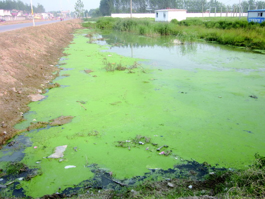 8月29日上午,記者來到張先生所說的那條河流,看到的卻是另一番模樣。整條河流幾乎被一層厚厚的綠藻覆蓋,撥開綠藻是黑黑的河水,散發(fā)著陣陣惡臭,蚊蠅滿天飛。