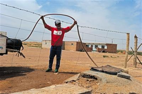 額里斯鎮(zhèn)特莫烏拉嘎察(村民組),是最接近化工園區(qū)的村民組,最近的居民離化工園區(qū)不過1公里。20歲的巴特爾(化名)就是這里的居民,記者看到他正在用太陽能發(fā)電機,從自家水井抽水注入儲水皮囊中,準(zhǔn)備澆灌幾里外菜園里的青菜。巴特爾的家在騰格里沙漠水源地上游,幾年前幾米下就能抽上水,現(xiàn)在水位下降至少40多米。