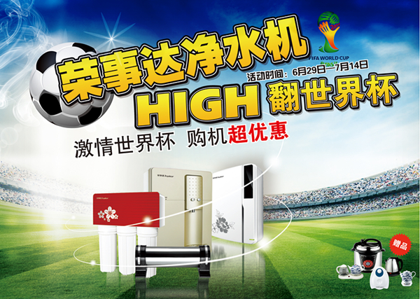 全世界共襄的足球大戲已經(jīng)拉開(kāi)戰(zhàn)幕,四年一度的王者之戰(zhàn)正趨于激烈。為回饋廣大消費(fèi)者對(duì)榮事達(dá)凈水機(jī)一貫的支持與厚愛(ài),值巴西世界杯之際,榮事達(dá)凈水機(jī)將于2014年6月29日至7月14日面向全國(guó)開(kāi)展“High翻世界杯”活動(dòng)?;顒?dòng)期間,榮事達(dá)凈水機(jī)將在各地開(kāi)展一系列世界杯主題讓利活動(dòng),為在南美鏖戰(zhàn)的足球英雄們搖旗吶喊!