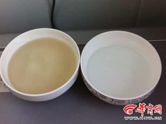 昨日下午,在該小區(qū),華商報(bào)記者看到,小楊家的自來(lái)水確實(shí)呈淡黃色,通過(guò)凈化后,水就變得清澈透明。淡黃色的水沒(méi)有氣味,喝下去也基本沒(méi)有味道。