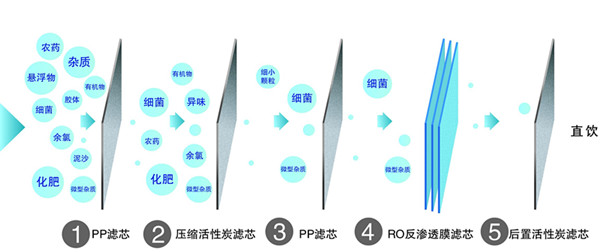 第一級pp棉濾芯,主要對進入原水初級過濾,能去除水中1微米以上的泥沙,鐵銹,固體污染物等。第二級活性炭濾芯,能吸附水中的異色、異味、氯氣及其他一些對人體有害的物質(zhì)。第三級是精細PP濾芯,深層凈化水中細菌、化學污染、重金屬等雜質(zhì)物。第四級是RO膜,經(jīng)過前三級濾芯處理后,水中部分較大的雜質(zhì)已經(jīng)被排除了,RO膜孔徑在0.001微米,主要去除水中除純水之外的其他細小污染物,如:細菌、病毒、余氯等。第五級濾芯是T33(活性炭),它的作用主要是繼續(xù)吸附水中殘留異味、異色,同時分解純水中的營養(yǎng)礦物質(zhì)。 - [關閉] [打印]
